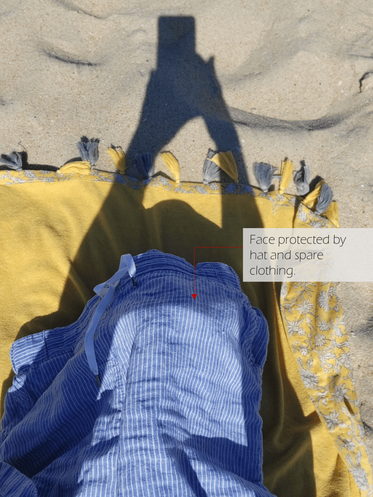 Spray yourself with #60 sunscreen. Pick your spot and spread your beach towel with care, so as to pretend the sand will never invade between you and the towel. Lie down. Wiggle yourself into the sand to achieve the perfect sculptural support for maximum comfort. Cover your face to block the intense light from your eyes. Be amazed that 8 minutes ago the sun emitted these energy particles that gently warm and even cook you. Enjoy for three minutes. Decide you are bored, get up and go play tag with the waves.