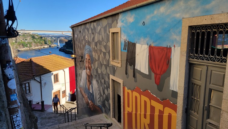 I’m well into my third year living in Porto (!) and there are still wonderful surprises to discover. One day I meandered onto a narrow, nondescript street that begins at the top of the hill near the old city wall. As I descended steep stairs, the sight of cheerfully painted walls on the old homes began to appear. The closer I got, the more amazing they were.